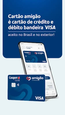 Sua jornada financeira é simplificada com o poder de gestão na palma da sua mão. Pelo aplicativo Conta Digital Amigão, você acompanha o limite disponível, monitora todas as suas compras e acessa uma gama completa de serviços financeiros. Amplie seu controle adicionando até 4 cartões suplementares, gerenciando as despesas de seus dependentes com transparência. E para qualquer dúvida ou necessidade, conte com o Atendimento Humanizado Cooper: uma equipe dedicada e personalizada, acessível por chat, e-mail, WhatsApp ou telefone. Aproveite também as vantagens exclusivas do programa Vai de Visa e a facilidade de depósitos via boleto ou Pix, tudo para uma experiência completa e sem complicações com o Amigão Visa.