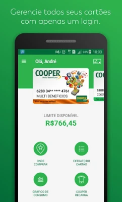Facilite sua gestão de cartões Cooper Card. Consulte saldos, extratos, faturas, limites e a rede credenciada de forma prática. Transfira saldos e fique por dentro das últimas novidades, tudo em um só lugar para otimizar o uso do seu cartão.