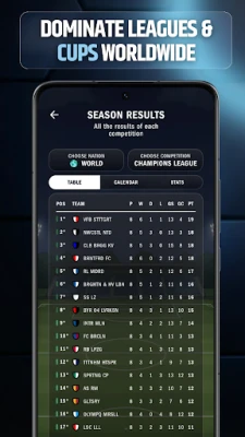 Guie seu time à glória nas competições mais prestigiadas. Participe dos campeonatos e copas mais renomados, trabalhando para consolidar a supremacia do seu clube no cenário mundial. Antes de cada desafio, estude seus adversários com profundidade, analisando seus pontos fracos e estatísticas atuais para personalizar sua tática e formação, garantindo uma vantagem decisiva. Colecione uma infinidade de prêmios, desde a Bola de Ouro e o Golden Boy para suas estrelas, até os troféus de equipe que celebram sua gestão vitoriosa.