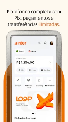 Mas as facilidades do Inter não param por aí. Explore o Inter Shop e transforme suas compras online em economia real, recebendo cashback em suas lojas favoritas. Proteja o que importa com a Plataforma de Proteção Inter, escolhendo entre diversas opções de seguros. Mantenha-se conectado com o Inter Cel, que oferece a maior cobertura de internet móvel do Brasil, bônus e cashback em todos os planos. Cuidamos do futuro dos seus filhos com a Conta Kids e impulsionamos a independência dos jovens com a Inter You. Acumule pontos valiosos no Inter Loop e troque por milhas, descontos na fatura, mais cashback ou investimentos. De empréstimos personalizados a ferramentas como a Bússola para controle de orçamento e o Inter Viagens para suas próximas aventuras, o Inter é a única plataforma que você precisará para uma vida mais simples e completa.
