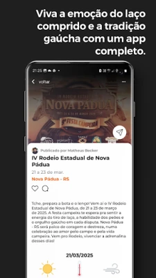 Sua jornada até a arena também fica mais fácil e prazerosa. Rodeiando integra um sistema de navegação intuitivo, guiando você diretamente aos rodeios escolhidos, enquanto a previsão do tempo garante que você esteja sempre preparado para as condições climáticas de cada dia de competição. Além disso, os convites digitais oficiais permitem que você explore, interaja e compartilhe os detalhes de cada evento com amigos e familiares, fortalecendo os laços da comunidade. Rodeiando é mais do que um app; é a sua arena digital, um tributo vibrante à paixão e à perseverança do rodeio.